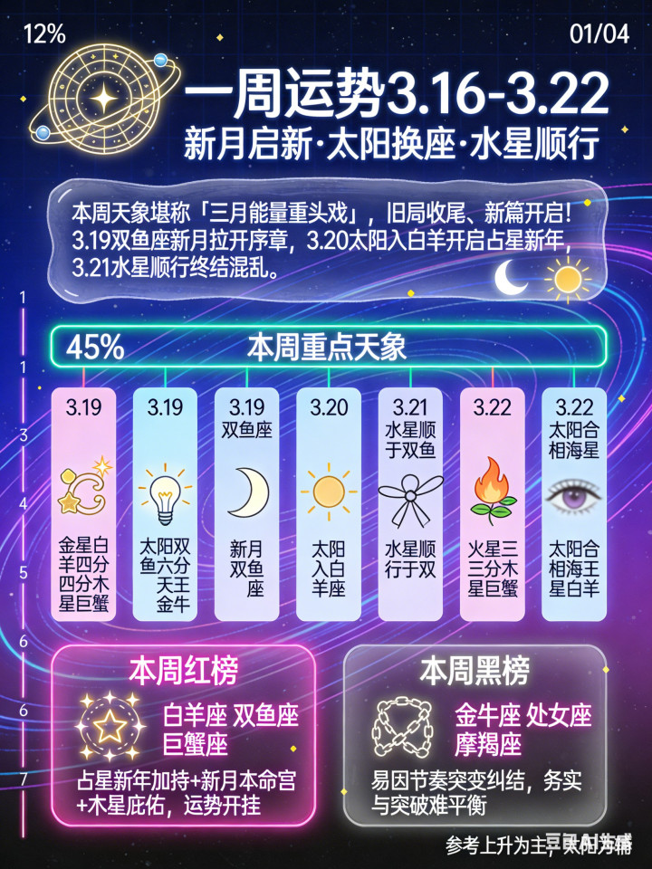 友友们,本周的天象号称「三月能量重头戏」,主打一个“旧局遣散、新篇开启”!中枢看点是3.19双鱼座眉月拉开新序章,紧接着3.20太阳入白羊认真开启占星新年,白羊的果敢能量全面上线,而3.21水星顺行透彻闭幕逆行杂乱,相通、酌量、想路一键归位。