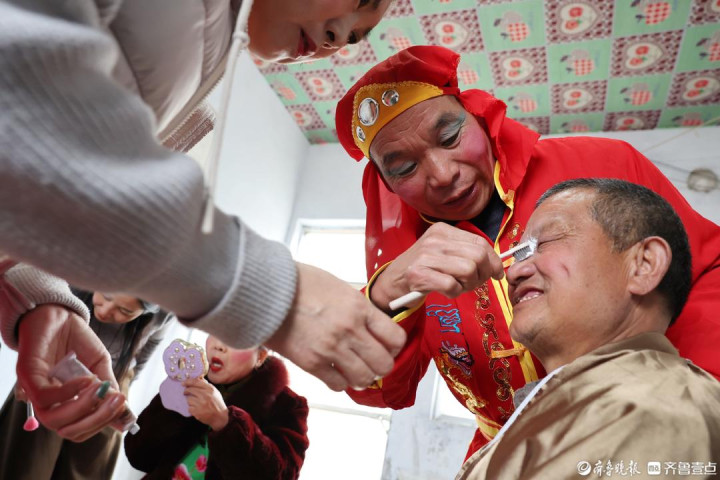 献技前,李沛庆用牙刷为队员勾勒脸谱。莫得专科化妆间,一支牙刷描出几十年老技巧。