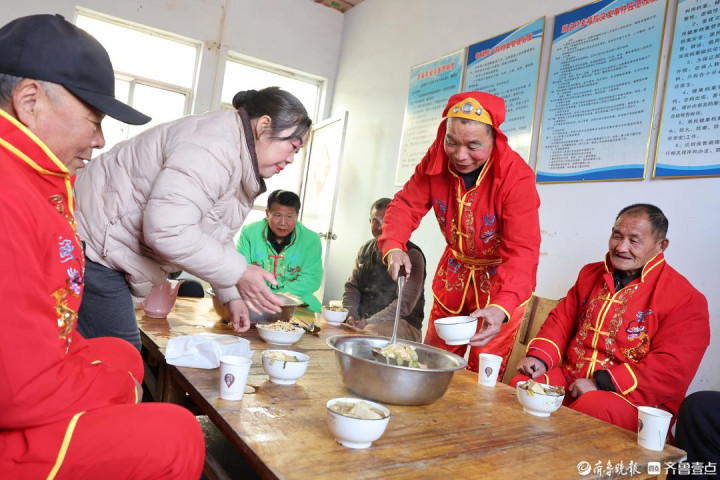 饰演刚法例回到村里,李沛庆顾不上卸妆,先给队员们盛上热饭。