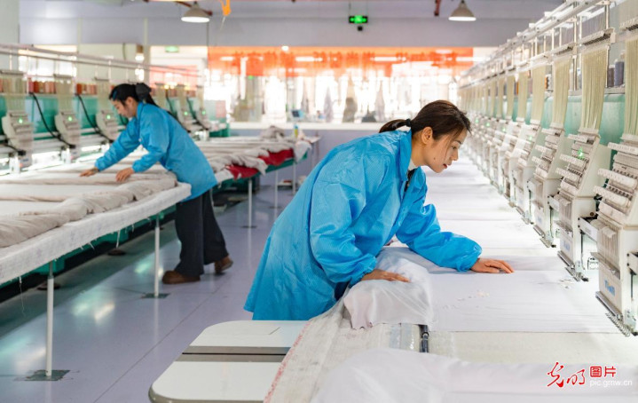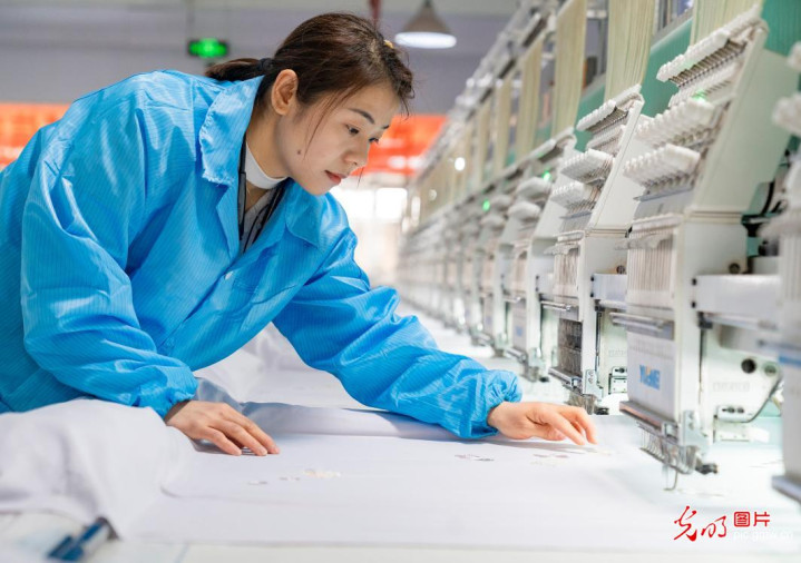 2026年3月15日,位于江苏省南通市通州区川姜镇的熟练衣家纺智能化坐蓐车间内,工东谈主在坐蓐线上发愤。(翟慧勇摄/光明图片)