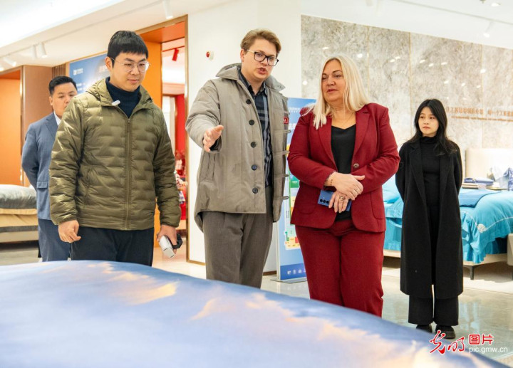 2026年3月15日,俄罗斯客商在位于江苏省南通市通州区川姜镇的熟练衣家纺查验家纺居品。(翟慧勇摄/光明图片)