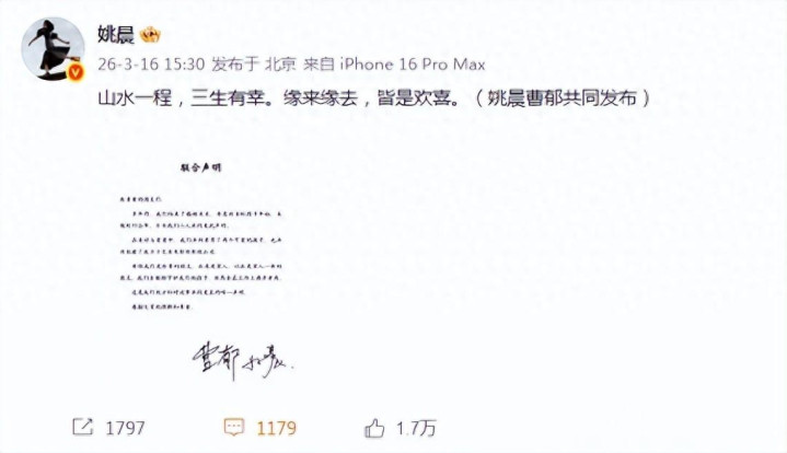3月16日下昼,演员姚晨猝不足防在个东说念主外交平台发文吏宣与曹郁仳离,几乎惊呆世东说念主。毕竟,两东说念主成婚以来并莫得出现过什么负面新闻,哪怕合体秀恩爱的技能很少,但亦然公认的恩爱夫妻。没念念到,临了他们也最终没能逃过仳离的运说念,如实让东说念主唏嘘不已啊!姚晨写到:“山水一程,三生有幸,缘来缘去,齐是欢笑”。