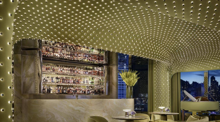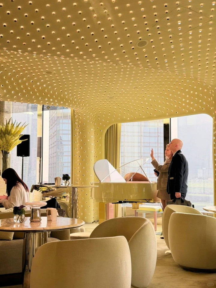 那天不是包场。白昼时段,店里照样有东说念主吃饭喝酒。你能思象的“高尚场地”在这儿很得志:落地玻璃、橄榄绿的主颜色、抛光钢制产品反着光,墙体和天花密密匝匝镶着灯体,像把星空搬进室内。