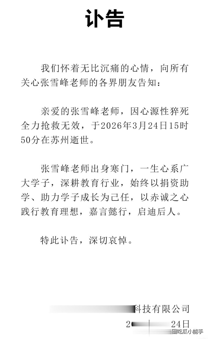 昨天晚上,一霎传来了历练老诚张雪峰离世的讯息,让不少东谈主王人合计难以置信,内行王人合计这个是假的讯息,直到他的公司发布了讣告,他外交平台的头像全部形成了曲直,才终于慑服了这个事实!