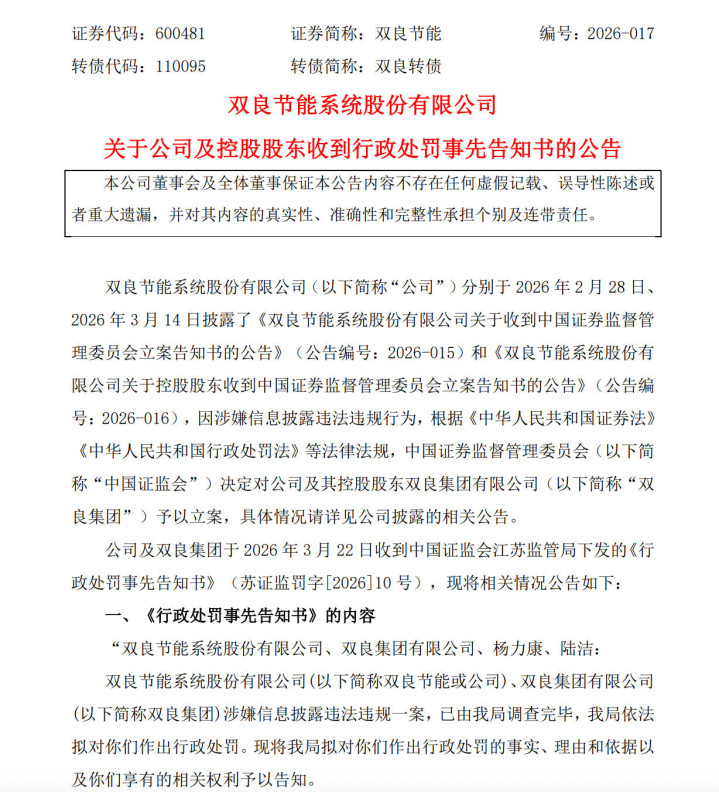 3月22日,光伏龙头双良节能系统股份有限公司(600481.SH)过甚控股鼓励双良集团收到江苏证监局下发的《行政处罚事前见告书》。因通过微信公众号发布波及SpaceX国外订单的误导性信息,组成信息露馅非法违纪,监管机构拟对双良节能及双良集团各罚金400万元,对董秘杨力康及双良集团品牌部总司理陆洁各罚金250万元,悉数1300万元。