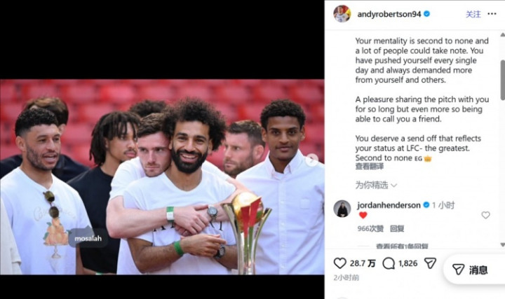 直播吧3月25日讯萨拉赫官宣赛季截止后离队,他的利物浦队友罗伯逊通过酬酢媒体奉上告别。