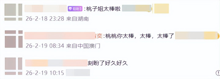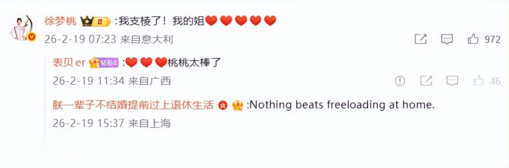 她在应酬平台转发佳音,慷慨地连用三个“太棒了”,直呼“为你欢快,我的桃桃”。