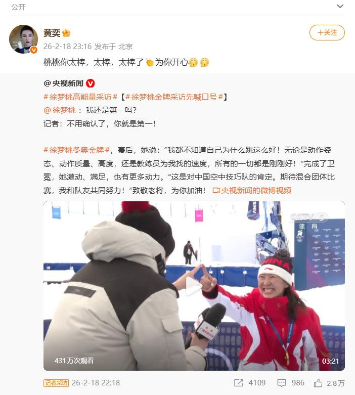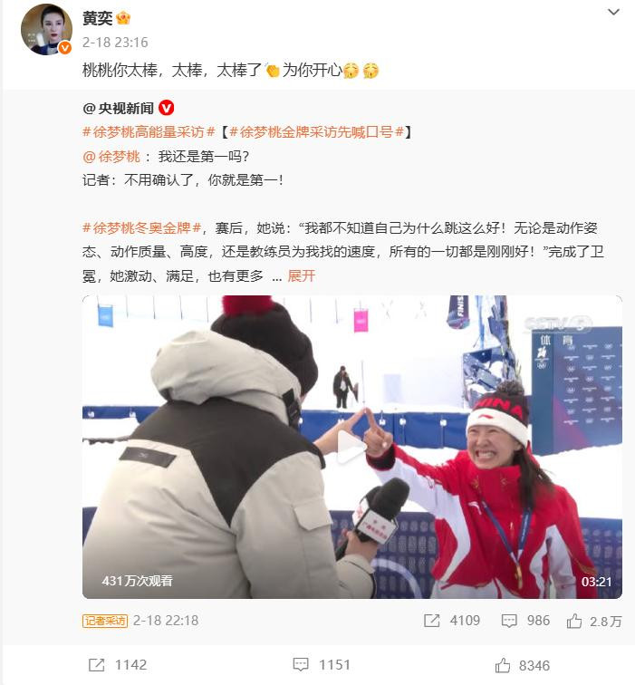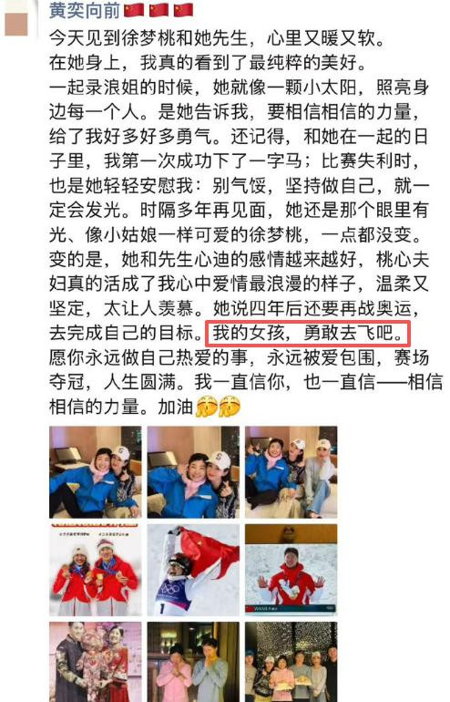 当徐梦桃一举夺得冬奥会冠军的音讯传来时,黄奕是第一批奉上祝愿的好友。