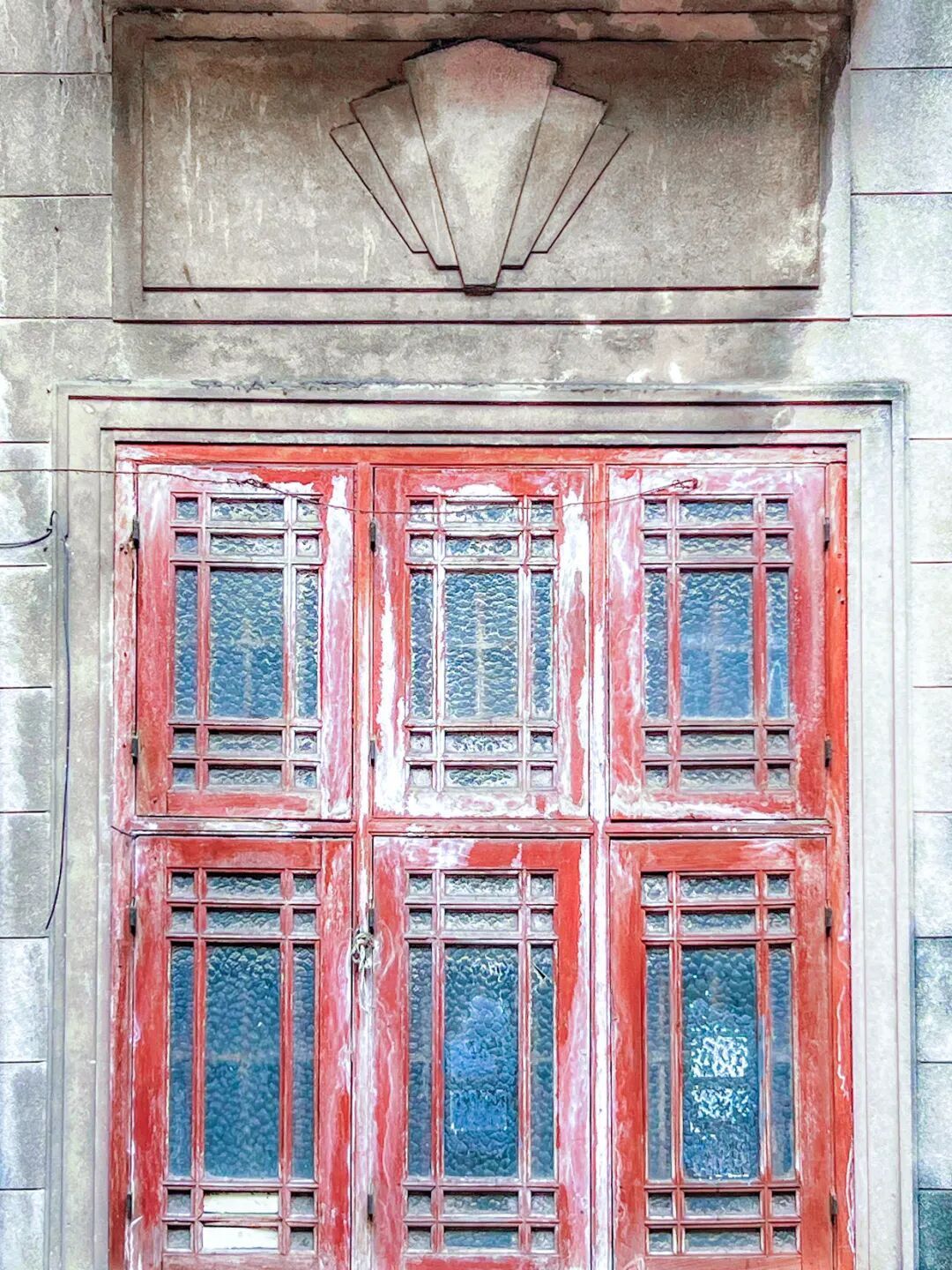 二层凸出方形阳台,栏板中部漏空,有水刷石雕栏,纹样别致。