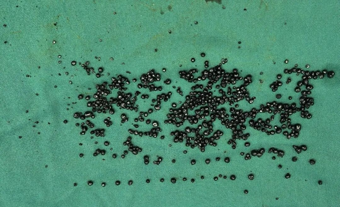医护东说念主员耐性缜密地计帐,一颗颗将结石一说念取出,术后盘点数目时发现,这些小小的结石果然快要300颗!