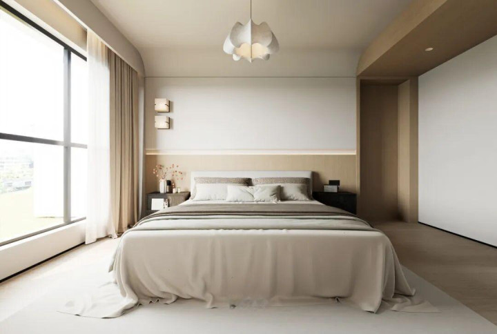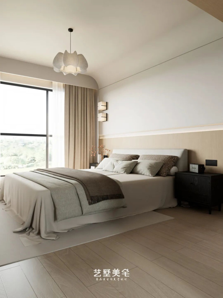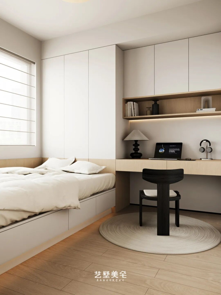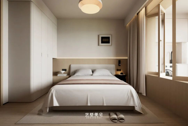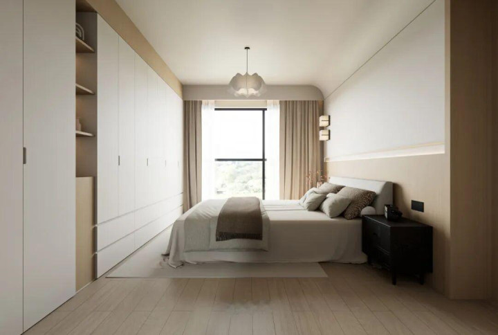 阳台移门下方定制储物地柜,上方搭配原木折叠门,开合自如;日常动作静谧逍遥区,夜间闭合又能有用隔音,实用与静谧兼得。整面收纳衣柜与床头柜无缝贯串,延长至床头与墙面形影相随,空间连贯融合,收纳与好意思感兼具。