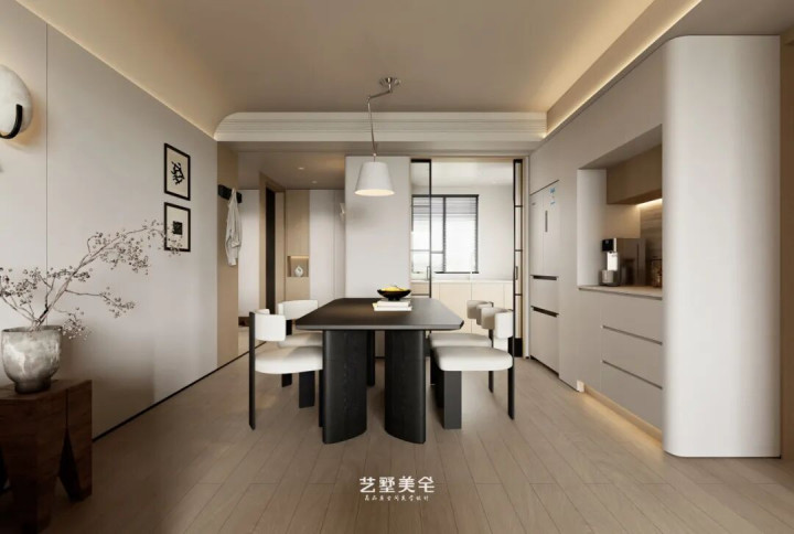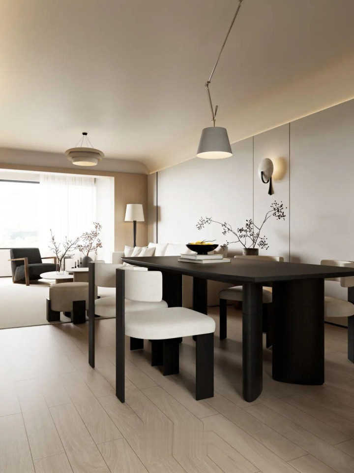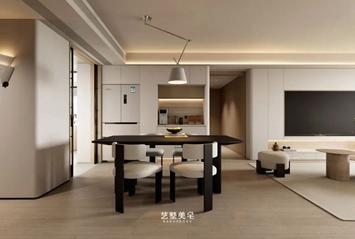 奶白色艺术漆墙顶通刷,举座质感干净高等;侧边通过吊顶内嵌线性灯带,柔柔色泽充盈空间,称心基础照明需求。整面收纳柜与电视一体镶嵌,并趁势延长至餐厅水吧区域,空间连贯融合,既整洁利落,又兼具完备功能。另一侧以轻松造型线条贯串门厅,在视觉上有用拉漫空间比例;搭配中古壁灯与艺术挂画点缀,增添邃密氛围。极简工艺缝的细节处理,进一步丰富立面档次,让举座更显风雅高等。