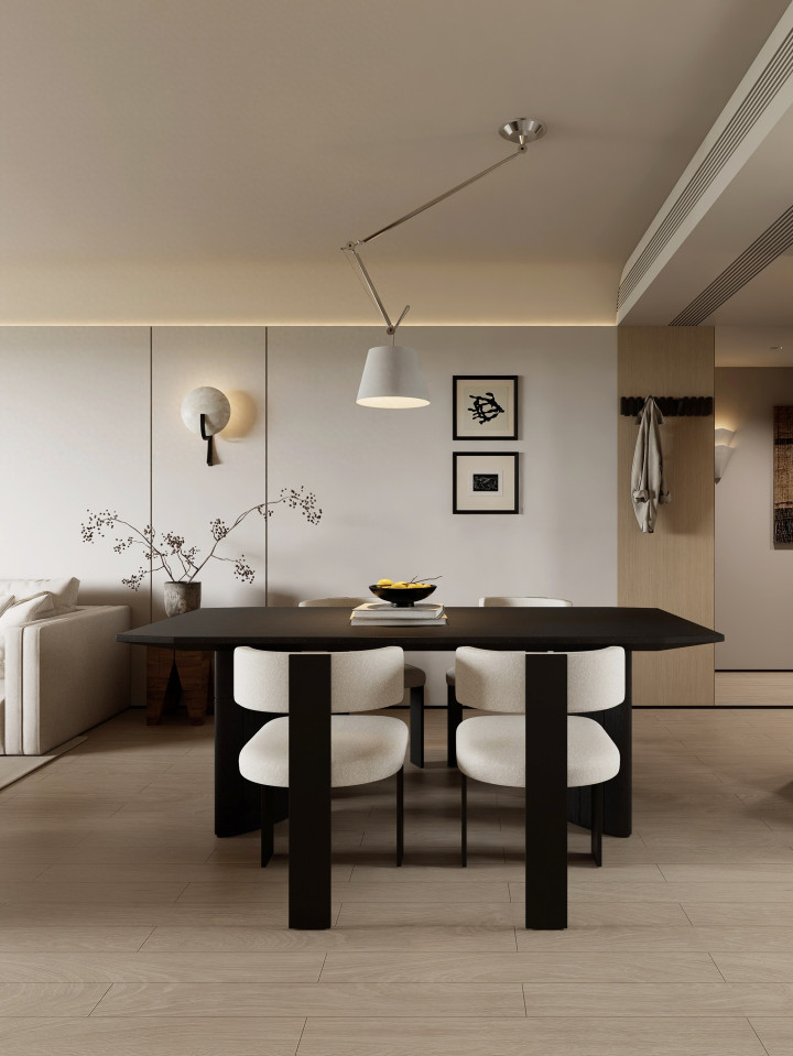 水吧柜内嵌雪柜,规整利落;预留风雅小台面,称心日常小家电唾手摆放。一盏经典摇臂吊灯悬于上方,实用之余更添复旧韵味。实木餐桌椅温润安逸,质感当然高等。餐桌礼聘不靠墙布局,环绕酿成指点洄游动线,空间通透又显安详。
