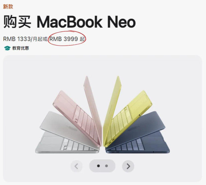 MacBook Neo的起售价只比新款iPhone 17e贵了100元;在苹果官网享受训导优惠后,售价仅为3999元起。