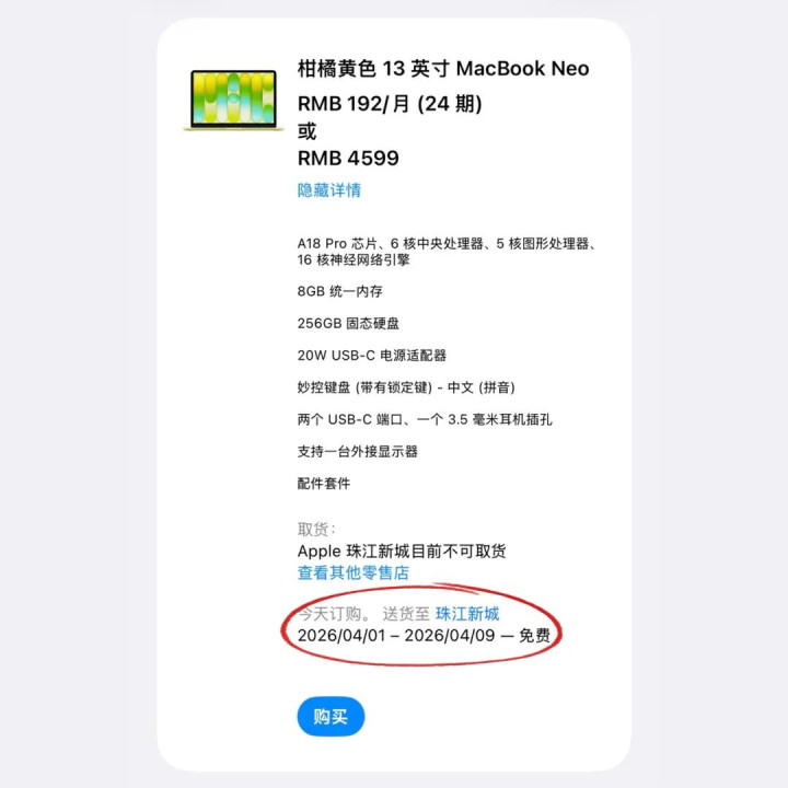 相关词由于MacBook Neo过于抢手,当今该机在全平台均处于“缺货”景象。