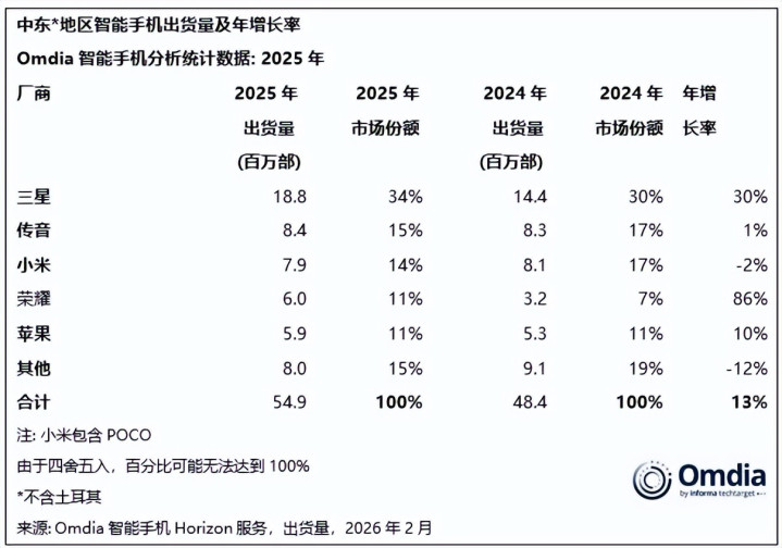 2025年的中东市集,三星和传音仍是占据前两把交椅,但真实的看点在于腰部力量的洗牌。