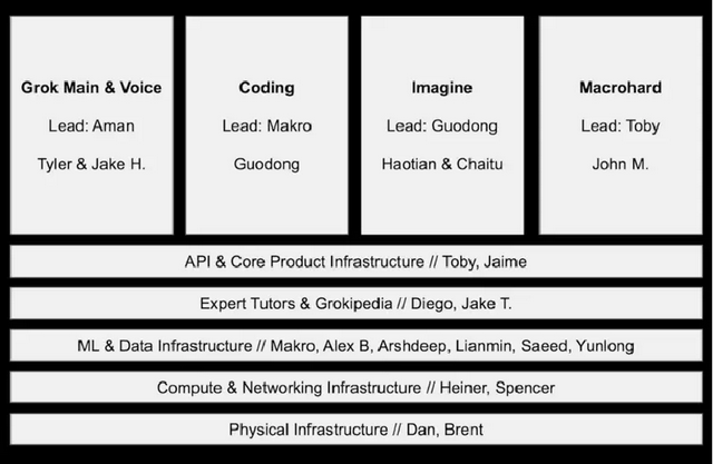 图注:xAI重组后的组织架构与负责东谈主名录