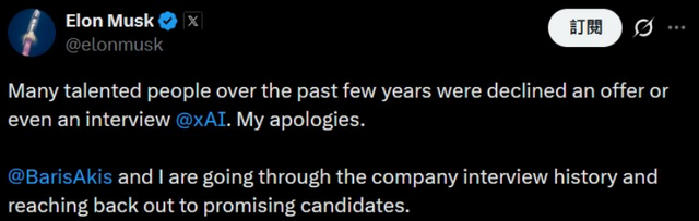 马斯克本东谈主的响应是,在酬酢媒体上涌现很对不起:昔时xAI莫得给行业内东谈主才实足多的邀请和口试契机,目下正在跟东谈主力部门负责东谈主沿途从新翻拣昔时的口试记载,看能否找出遗珠。