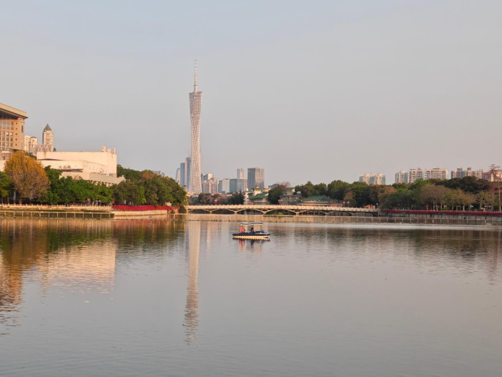比如说这张像片,后期剪辑的时间,我只思留住广州塔、划子和水面,进行二次构图之后,了了度也依旧在线。