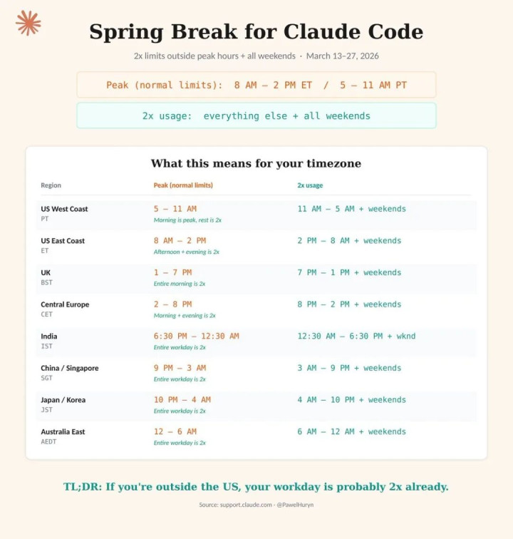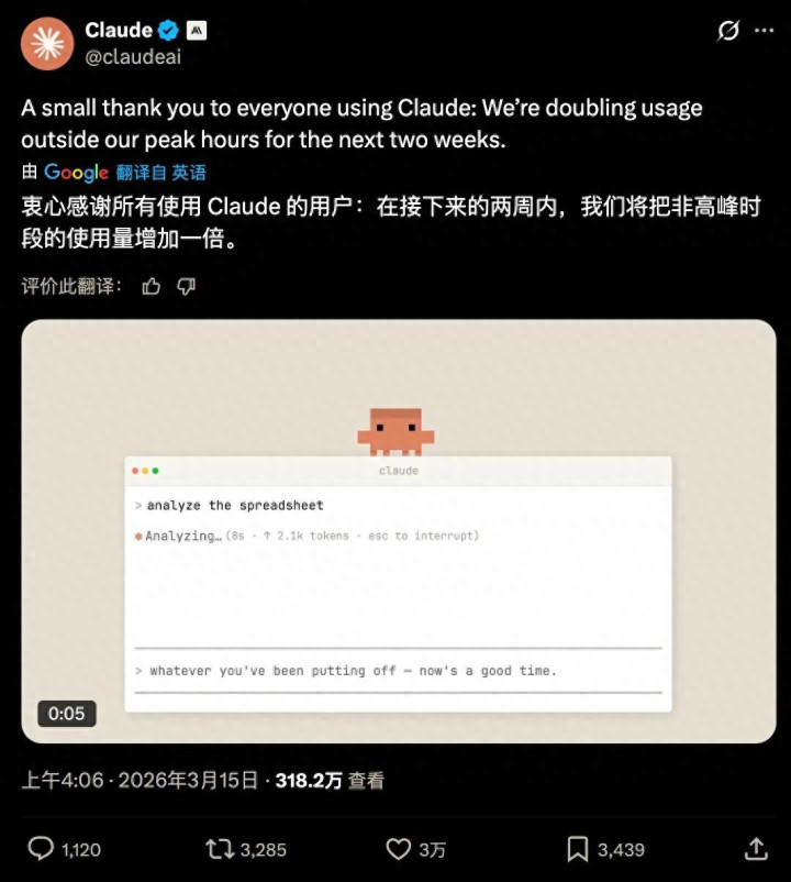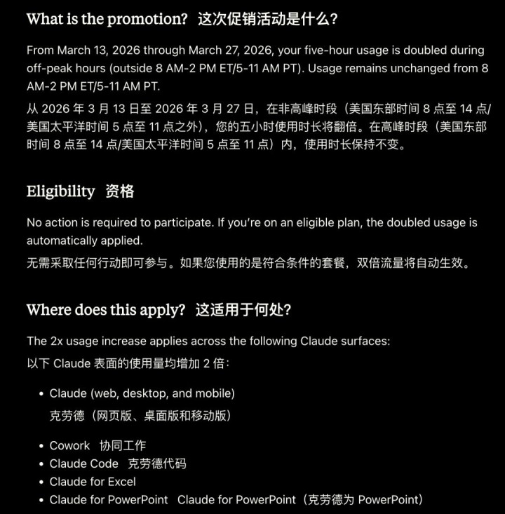 北京时候 3 月 14 号到 28 号这两周,Claude 搞了个限时「错峰双倍配额」行为。