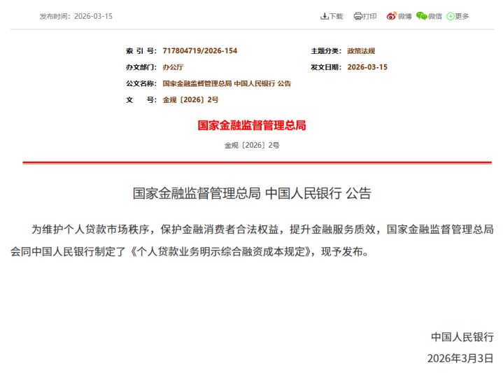 为珍重个东谈主贷款市集治安,保护金融蹧跶者正当权利,进步金融处事质效,3月15日晚间,金融监管总局、中国东谈主民银行连合髻布《个东谈主贷款业务昭示详尽融资老本法例》(以下简称《法例》),自2026年8月1日起实行。